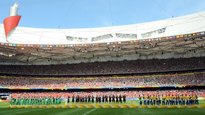 Bajo el fuego olímpico de Beijing, el podio del fútbol olímpico. De izquierda a derecha: Nigeria (plata), Argentina (oro) y Brasil (Bronce).