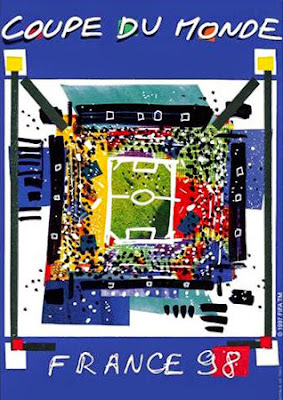 FRANCIA 1998 - Un estadio a trazos gruesos para el segundo mundial francés en el que puntos blancos y negros simulan ser el público sobre un fondo multicolor.