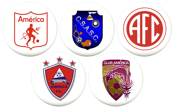 Vamos a los escudos: los nueve de arriba corresponden a clubes que incluyen o incluyeron el mapa continental o al menos la parte sudamericana: Sol de América (Asunción, Paraguay), América (México), América de Quito (Ecuador, en su logo anterior), Miami FC (Estados Unidos), Nova Venécia FC (Nova Venécia, Espirito Santo, Brasil), Real América (Santa Cruz de la Sierra, Bolivia), Atletic América (Escaldes, Andorra), Sol de América (Formosa, Argentina) y el América FC (José C. Paz, Argentina). Son solo algunos ejemplos.