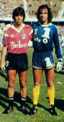 Carlos Valderrama (Junior) - Alan Valderrama (Millonarios): la imagen corresponde a 1993. La brillante carrera de El Pibe es bien conocida, tanto en la Selección Colombia como en los clubes Unión Magdalena, Millonarios, Deportivo Cali, Montpellier (Francia), Valladolid (España), Independiente Medellín, Junior, Tamba Bay Mutiny, Miami Fusion y Colorado Rapids (estos tres últimos de los EE.UU.). Con cualidades más modestas como volante, además de la camiseta de Millonarios Alan jugó en América, Junior, Caracas (Venezuela), Unión Magdalena, y Unicosta
