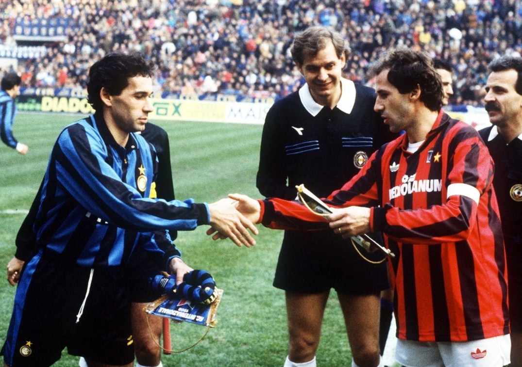 Giuseppe Baresi (Internazionale) - Franco Baresi (Milan): capitanes de dos squadras poderosísimas, se dieron este fraternal apretón de manos en San Siro. Giuseppe jugó en el Inter entre 1977 y 1992, mientras que Franco fue símbolo del Milan, única camiseta que vistió en su carrera, entre 1978 y 1997. Lo curioso es que alternaron mundiales: Franco fue seleccionado italiano en España 82 (campeón), Italia 90 y Estados Unidos 94, y Giuseppe integró la Azzurra en México 86.